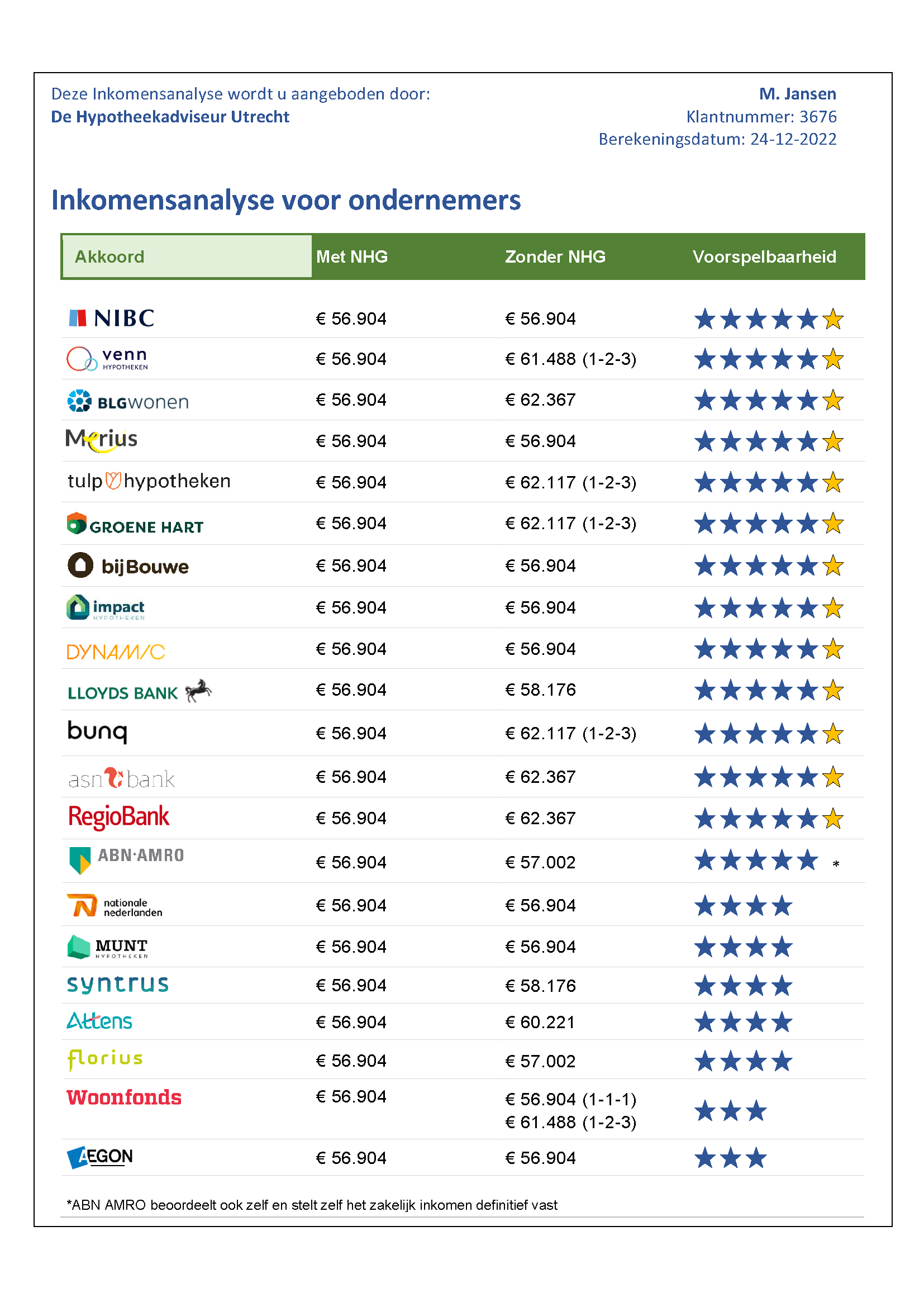De Inkomensanalyse biedt een zo goed mogelijke voorspelbaarheid van het zakelijk inkomen van
